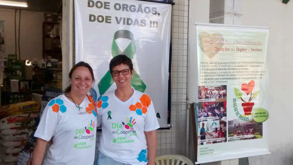 No Dia Internacional do Cooperativismo, comemorado em julho, Isabel e Deborah acolheram convite do agente de desenvolvimento humano da Cooperativa Sul Brasil, Ezio Kaneno, e distribuíram material educativo para cerca de 250 pessoas que passaram pelo estabelecimento.