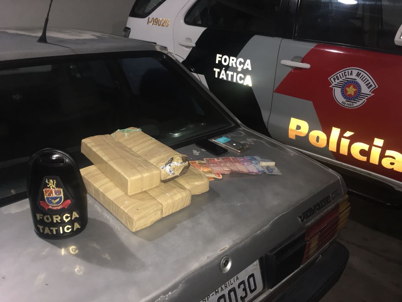 A Força Tática da Polícia Militar prendeu na madrugada desta sexta-feira (2), três rapazes com cinco tabletes de maconha em um Volkswagen Voyage com placas de Marília, no quilômetro 192 da rodovia SP-331
