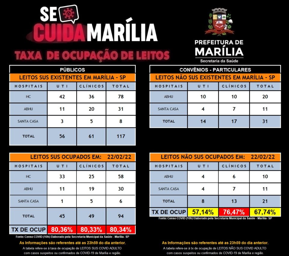 Nos hospitais de Marília, a ocupação de leitos públicos de UTI e da rede privada chegou em 100% nas últimas semanas, mas há alguns dias já vem demonstrando queda. Nesta terça-feira (22), a lotação era, respectivamente, de 80,36% e 57,14%.