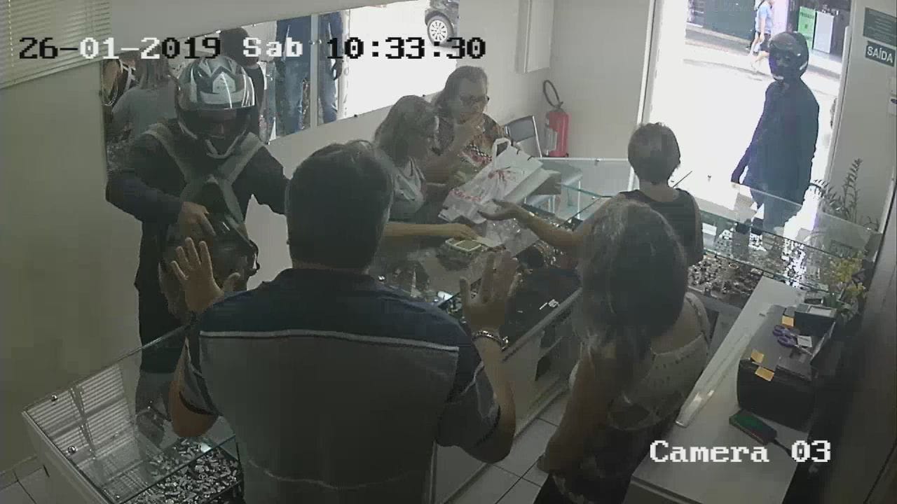 O crime foi registrado pelo circuito de videomonitoramento do estabelecimento comercial na rua São Luiz. Os dois assaltantes entraram na joalheria usando capacetes e óculos escuros e anunciaram o roubo por volta das 10h30.