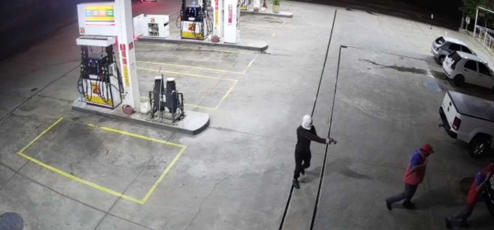 O crime aconteceu nesta última quarta-feira (13), mas as imagens só foram divulgadas agora. As câmeras mostram quando os dois homens chegam ao pátio e ameaçam os frentistas com um revólver. A polícia não descarta o envolvimento de mais criminosos na ação.