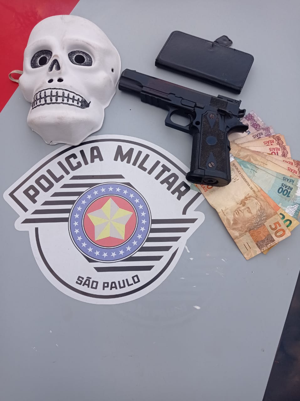 Durante busca pessoal, os PMs encontraram uma arma de brinquedo na cintura de um deles e R$ 75. Com o outro acusado foram localizados R$ 307 em notas diversas e um celular.