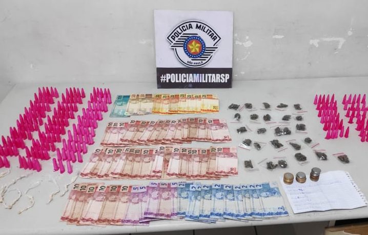 Os dois estavam com objetos nas mãos e tentaram fugir ao notar a presença da viatura. Eles foram detidos e com o adolescente havia 148 pinos com cocaína, 52 pedras de crack e R$ 775.
