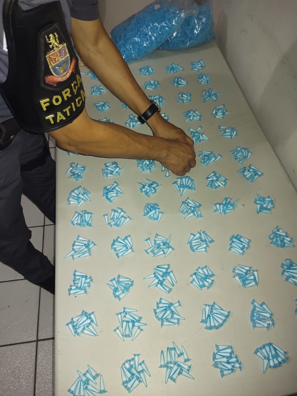 Na sacola havia 200 pinos com cocaína. No telhado a equipe policial encontrou mais 522 pinos com a mesma droga, além de 4 mil pinos vazios.