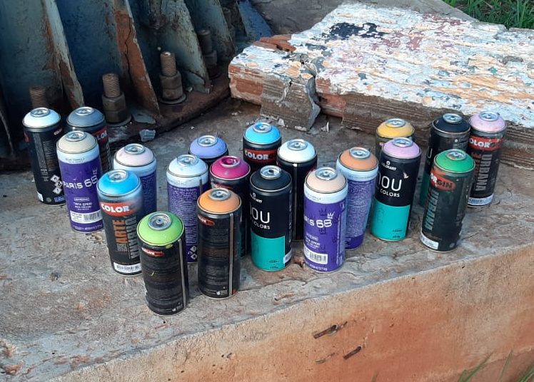 Foram apreendidas 23 latas de tinta spray. A perícia foi acionada para o local.