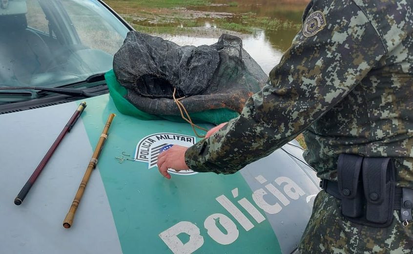 Ao passar pela represa do córrego Cascata, uma equipe visualizou duas pessoas dentro d’água. Os policiais desembarcaram, fizeram campana e confirmaram que a dupla estava pescando com técnica proibida, conhecida popularmente como “batida”, a qual consiste em utilizar anzóis múltiplos, sem isca.