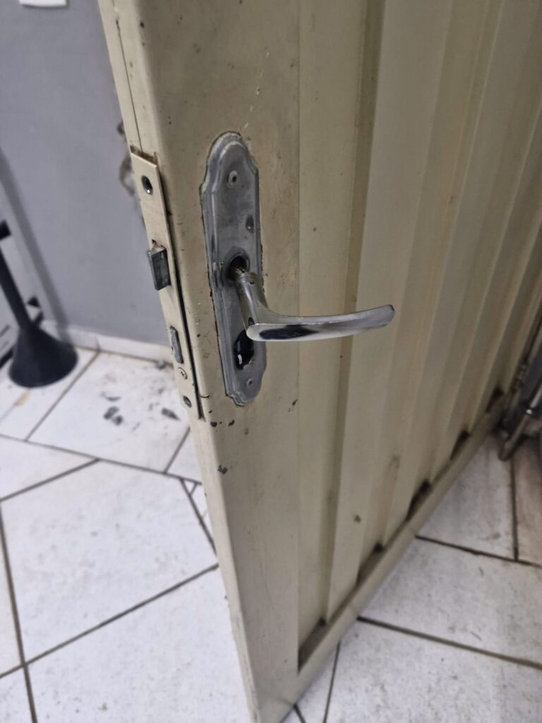 Uma das portas do estabelecimento; arrombamento (Foto: Marília Notícia)