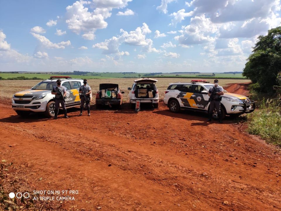 Foi realizada tentativa de abordagem e carros fugiram, sendo localizados em uma estrada rural, onde os militares observaram, à distância, os indivíduos deixando entorpecentes na mata.