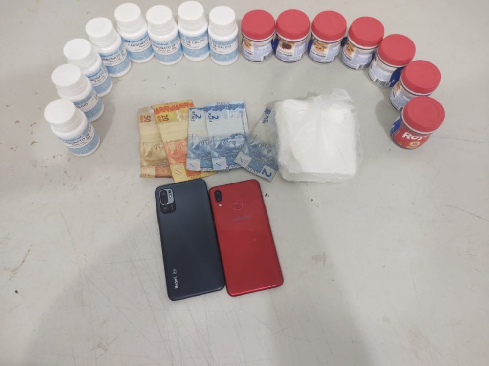 A dupla foi abordada e com eles havia dois celulares e R$ 50. No carro, os policiais encontraram um saco contendo um tijolo de cocaína, sete potes com substância branca a ser analisada e oito potes de carbonato de cálcio contendo pó branco que após perícia se constatou não ser droga, além de R$ 26.