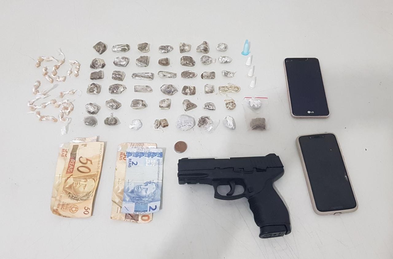 Com Matheus foram encontradas 45 porções de maconha, quatro pinos com cocaína, 39 pedras de crack, um celular e R$ 100.