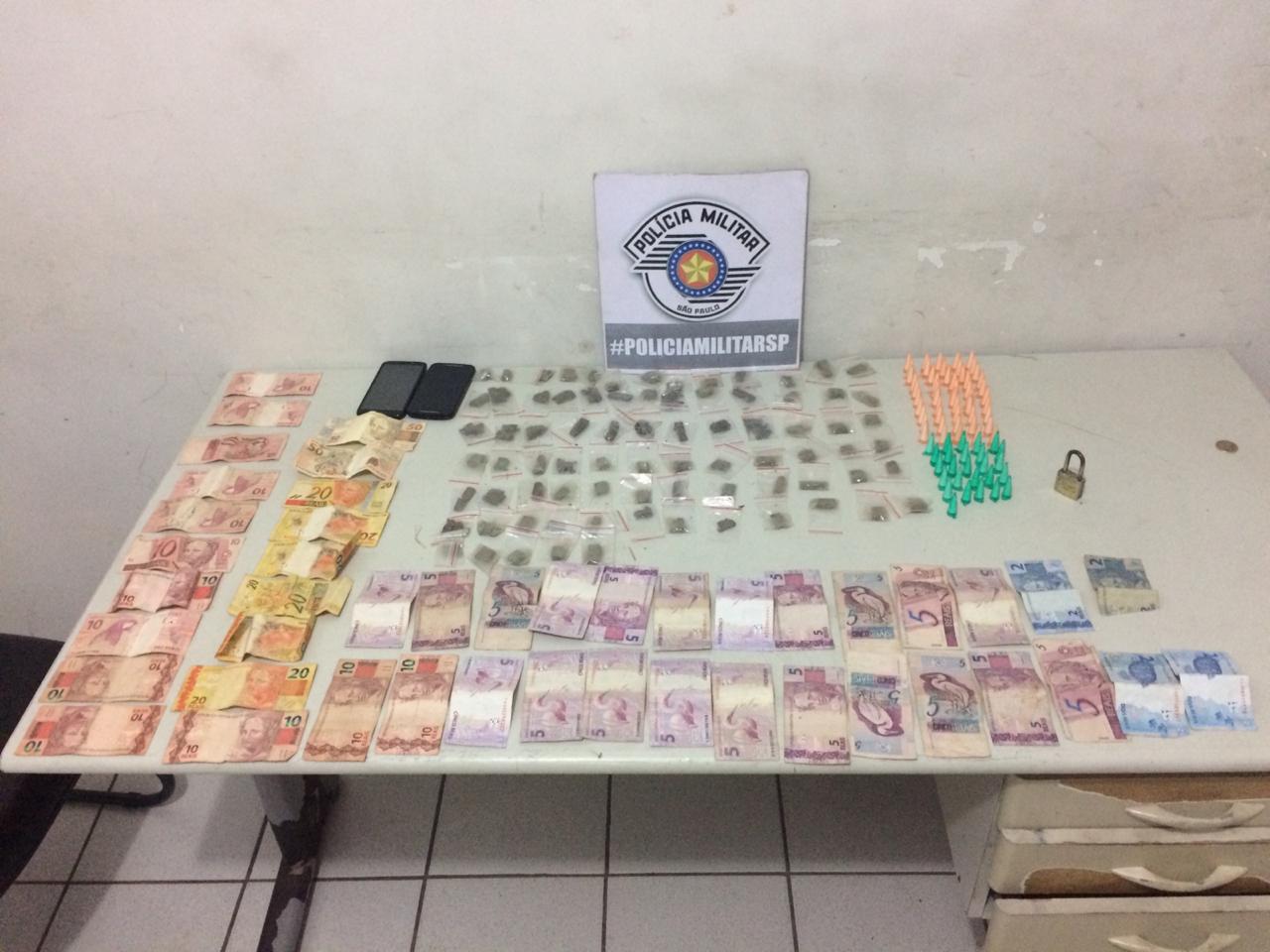 No automóvel os militares localizaram R$ 212 e 26 pinos de cocaína. No interior da casa foram apreendidos 50 pinos de cocaína e 69 porções de maconha.