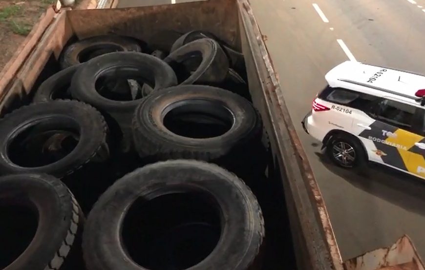 Um caminhão foi abordado e os policiais encontraram dezenas de pneus, eletrônicos, bebidas alcoólicas, produtos para cabelo, relógios, perfumes e duas armas de airsoft, todos sem nota fiscal.