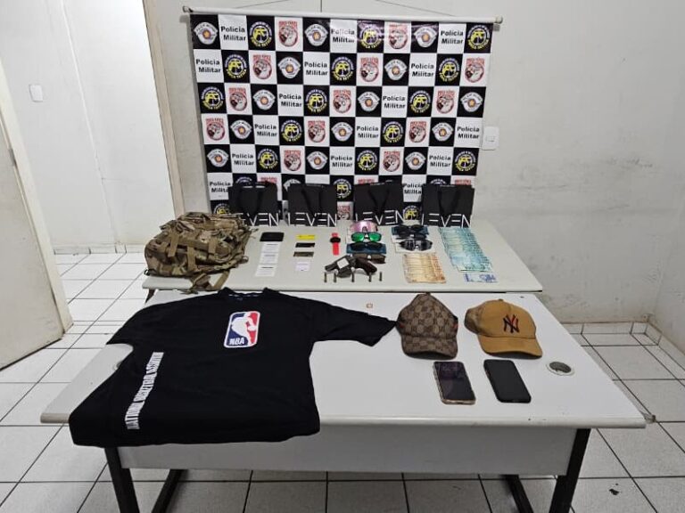 Durante a vistoria no veículo, os policiais localizaram papéis impressos usados no golpe, além de óculos novos que teriam sido adquiridos com dinheiro das fraudes. Sob o banco do motorista, foi encontrado um revólver calibre .38, da marca Taurus, com numeração suprimida e cinco munições intactas.