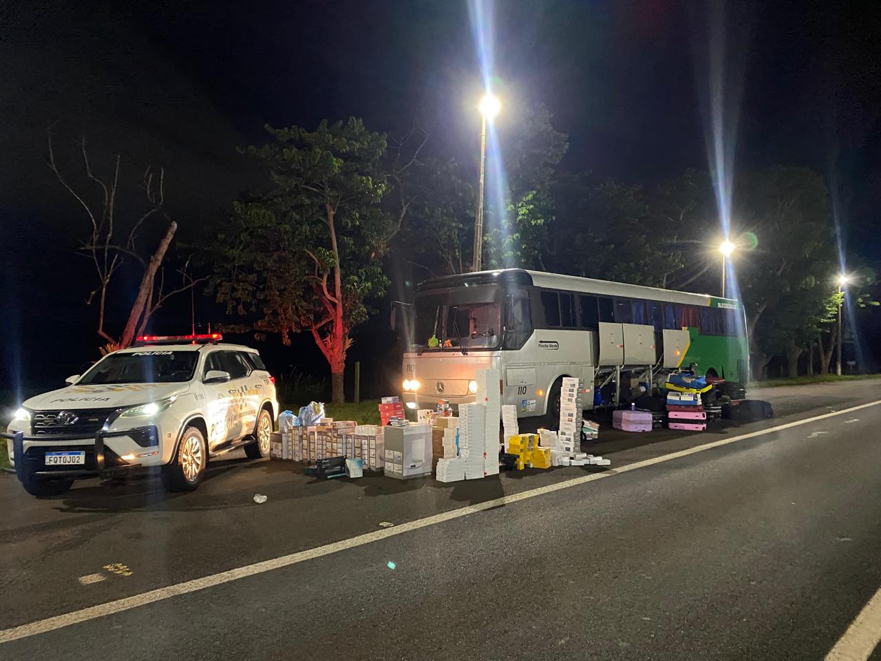 Os policiais abordaram um ônibus Mercedes Benz/O 400 pela rodovia e, durante a vistoria, localizaram no bagageiro externo uma grande quantidade de produtos eletrônicos e cosméticos sem documentação fiscal.