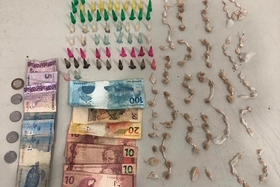 Dentro do saco plástico de Carlos de Oliveira, os policiais encontraram 105 pedras de crack, 57 pinos com a mesma droga e R$ 239 em dinheiro.