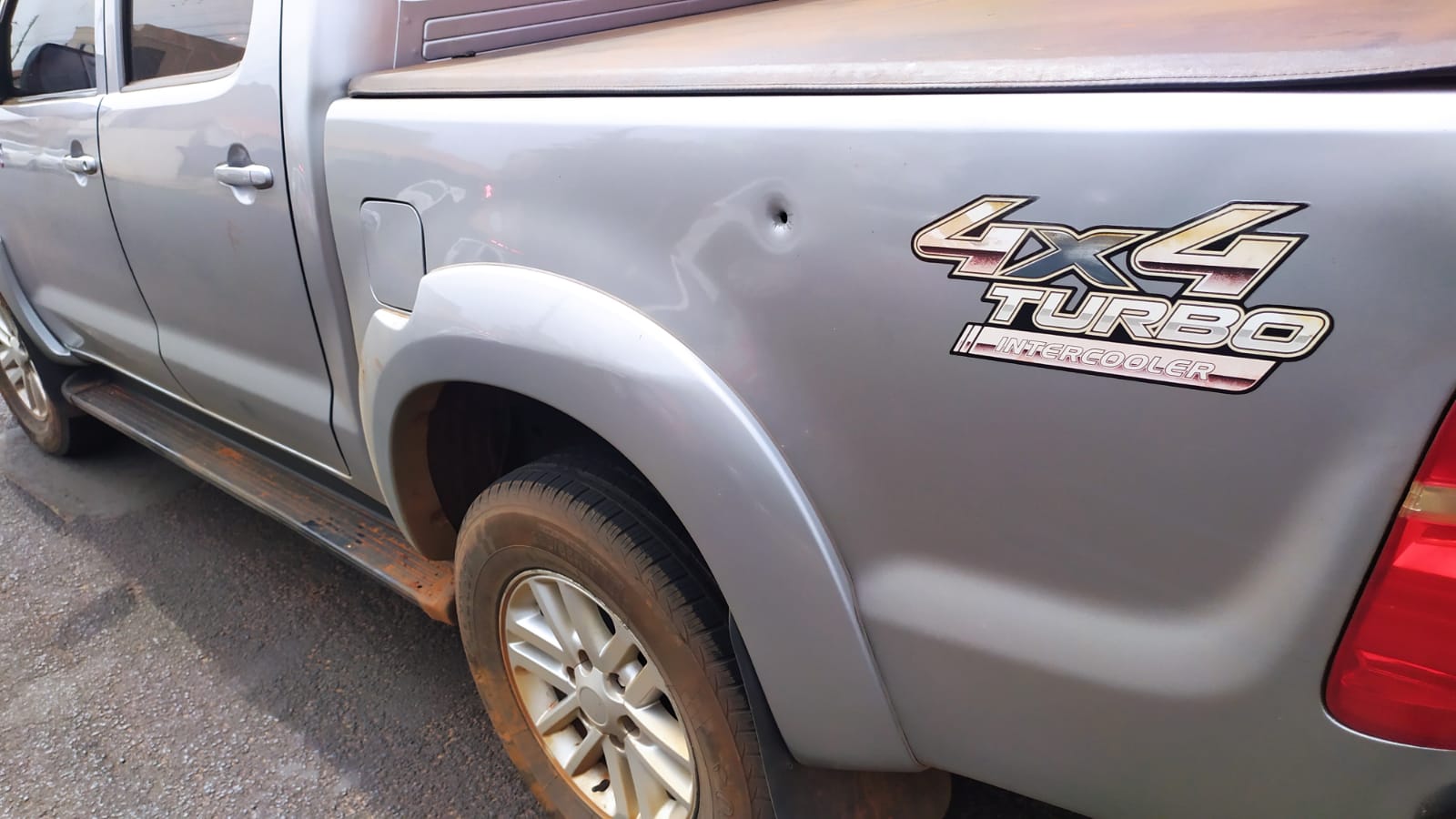 Um dos tiros atingiu a caçamba da caminhonete (Foto: Divulgação)