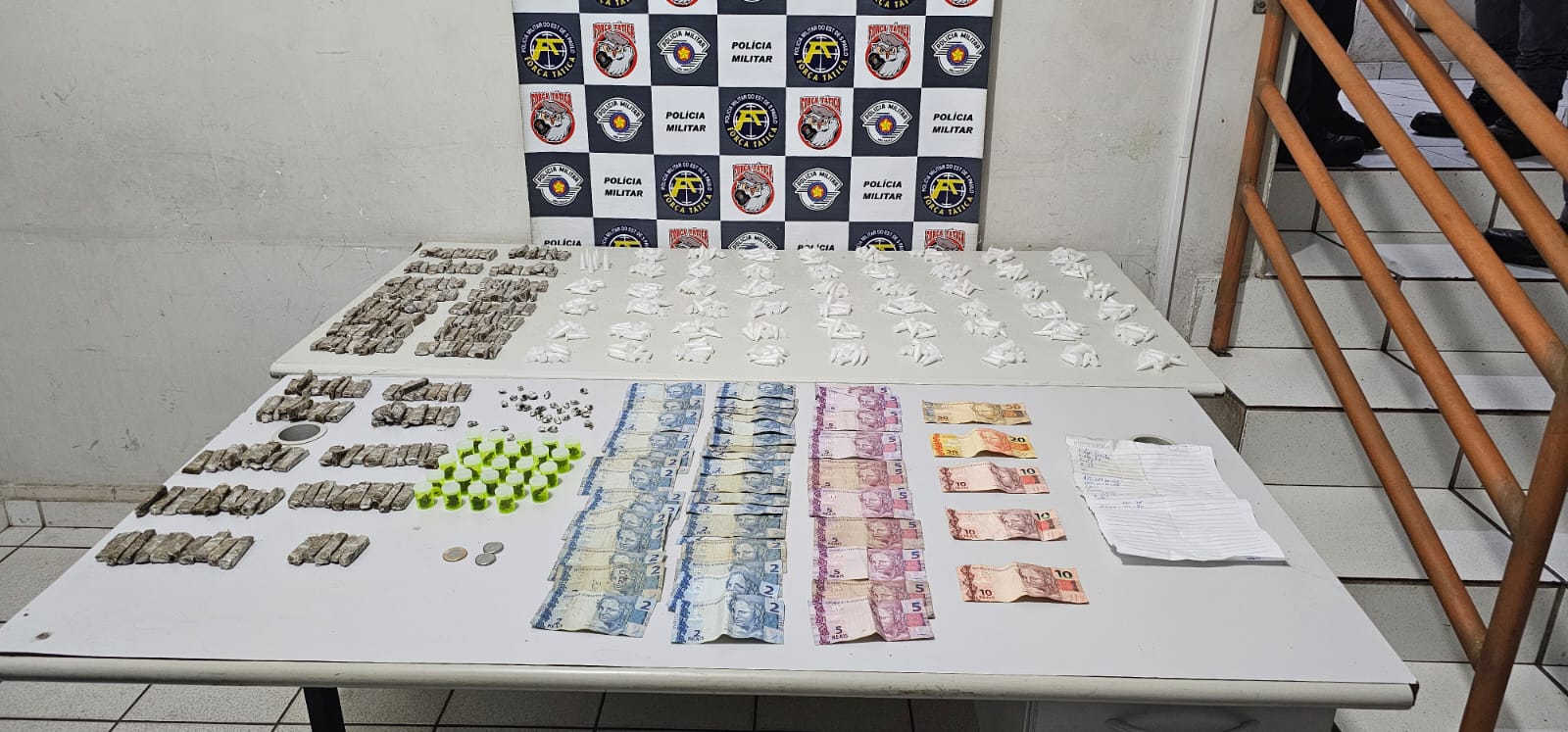 Com um deles, os militares encontraram 528 microtubos com substância análoga à cocaína, em total superior a um quilo, além de R$ 152. Já com o outro, foram apreendidas 314 porções de maconha, aproximadamente 1,3 quilo, R$ 75 e uma folha de caderno com anotações sobre o crime.