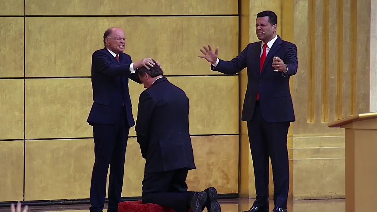 Em seguida, disse que, desta vez, Deus escolheu Bolsonaro para liderar 210 milhões de brasileiros. Pôs as duas mãos sobre a cabeça do presidente, com o óleo para a unção, e, enquanto uma música triunfal subia e milhares de pessoas sussurravam em orações, afirmou: “uso de toda a autoridade que me foi concedida por Deus para abençoar este homem, para lhe dar sabedoria, para que este país seja transformado, que faça um novo Brasil”.