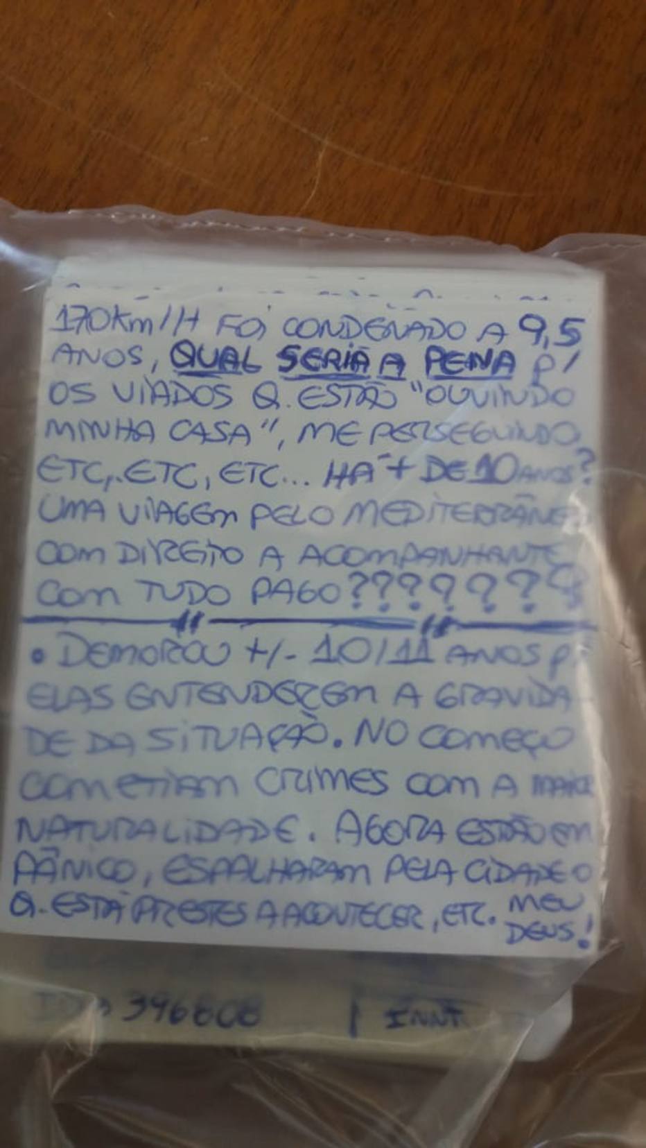 Em outra folha, Grandolpho diz que “os viados” estariam “ouvindo minha casa” e o perseguindo há mais de dez anos. “No começo cometiam crimes com a maior naturalidade. Agora estão em pânico, espalharam pela cidade o q está está preste a acontecer, etc. Meu Deus!”, registrou sem data.
