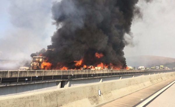 O acidente ocorreu em um viaduto. Uma das carretas carregava tinta e a outra levava sucata. Ambas colidiram e outros veículos que vinham na pista não conseguiram parar. Pelo menos 12 se incendiaram na colisão.