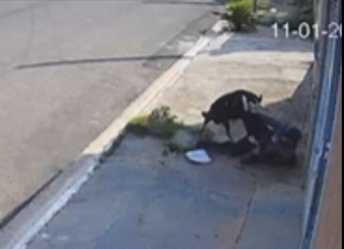 O ataque foi registrado por uma câmera de segurança. Nas imagens, a vítima aparece caminhando pela calçada, próxima a muros e grades, enquanto deposita os folhetos. De repente, um cão avança contra ele.