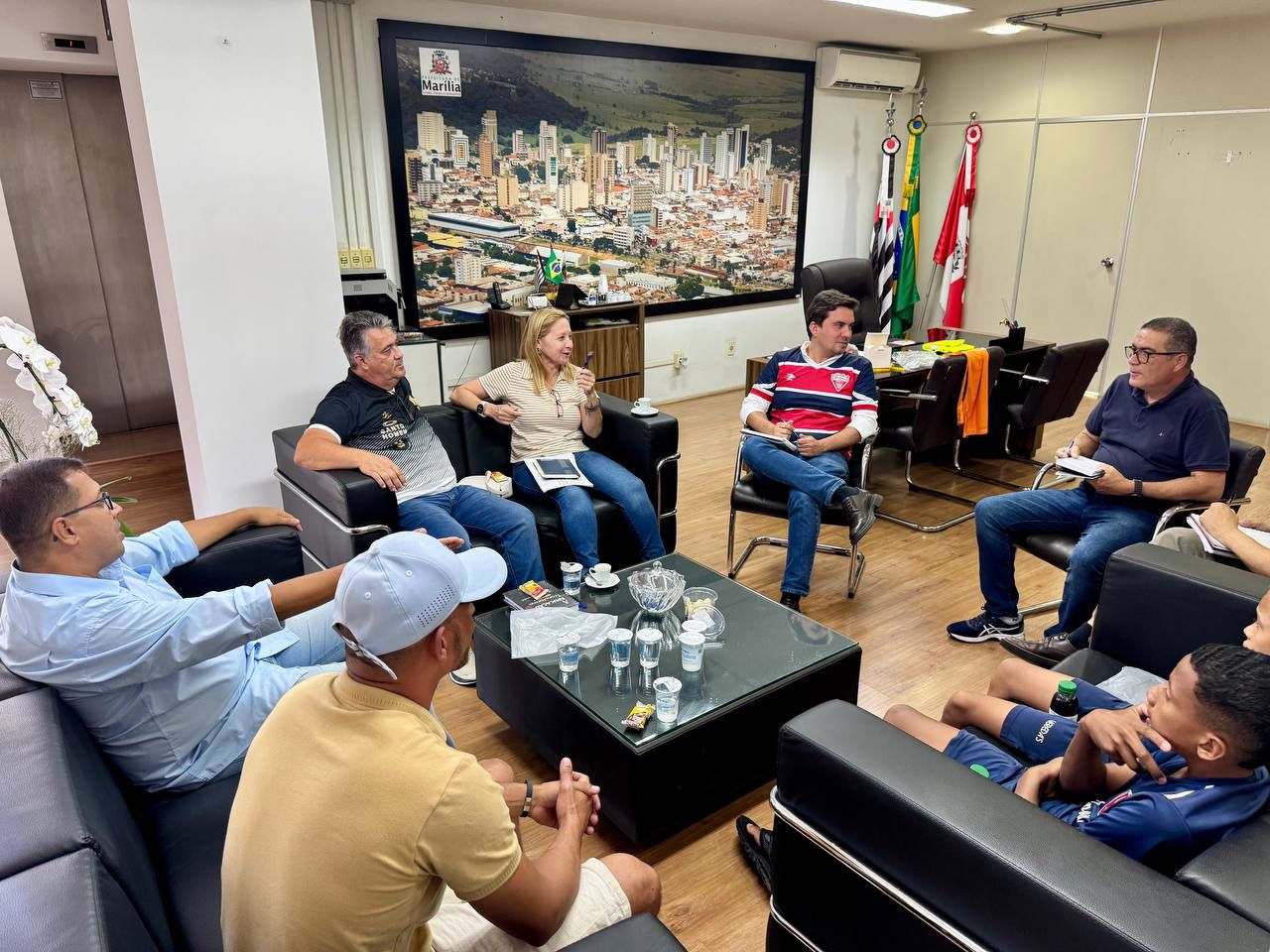 O prefeito de Marília, Vinicius Camarinha (PSDB), recebeu em seu gabinete membros da escolinha de futebol Inter Sport, do Centro Esportivo da Vila Altaneira. O encontro contou com a participação da secretária municipal de Esportes, Lazer e Juventude, Valeria Cavecci.