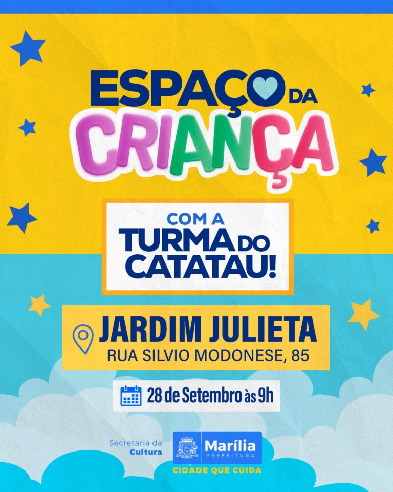 A Prefeitura de Marília promove no próximo domingo (28) mais uma edição do Espaço da Criança com a Turma do Catatau, das 9h às 12h, na rua Sílvio Modonese, no Jardim Julieta, zona norte da cidade. O evento é organizado pela Secretaria Municipal da Cultura e integra um projeto itinerante que ocorre mensalmente em diferentes regiões do município.