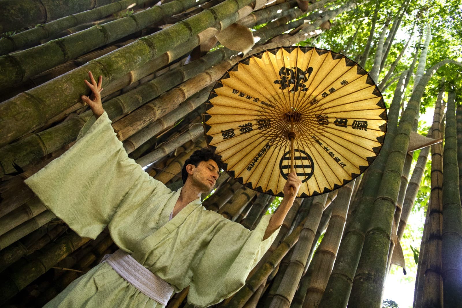 A encenação utiliza elementos simbólicos da cultura nipônica e referências do teatro e da dança Kabuki. As coreografias apresentadas em cena são assinadas pela diretora de Teatro Kabuki Fujima Yoshikoto, de 83 anos. A narrativa também revisita a história familiar do ator, com destaque para as relações com a avó e a bisavó maternas, ligadas ao processo migratório japonês no Brasil.