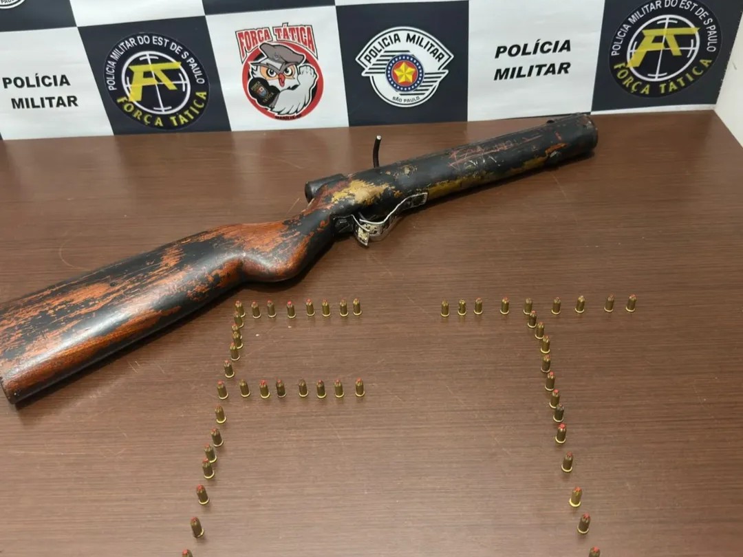 Durante diligência no local, os policiais localizaram uma espingarda calibre .22, de fabricação artesanal, escondida embaixo de um sofá. Junto ao armamento, foram apreendidas 52 munições intactas e uma deflagrada.