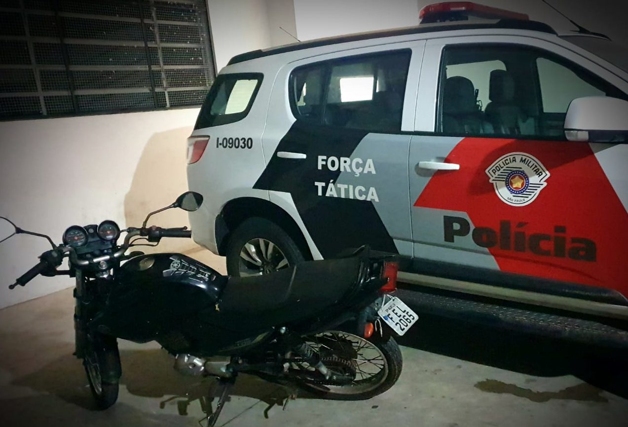 Com o condutor, identificado como Lucas, nada de ilícito foi encontrado, entretanto ao pesquisar a placa e chassi da moto foi constatado que o veículo era furtado desde o dia 6 de setembro de 2019.