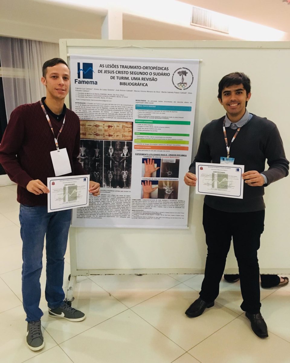 Os estudantes Fabrício Luz Cardoso e Enrico de Losso Seneme, acadêmicos da 5ª série do curso de Medicina da Famema (Faculdade de Medicina de Marília), juntamente com os docentes Prof. Dr. José Antônio Galbiatti (Disciplina de Anatomia Humana) e Prof. Dr. Marcos Vinícius Muriano da Silva (Assistente da Ortopedia e Traumatologia) tiveram seu artigo de revisão bibliográfica, intitulado: “As lesões traumato-ortopédicas de Jesus Cristo segundo o Sudário de Turim”, publicado na Revista Cubana de Ortopedia e Traumatologia, periódico semestral indexado nas bases de dados Scielo, LILACS, Cubaciencias, Latindex, Periódicas e Ulrich’s.
