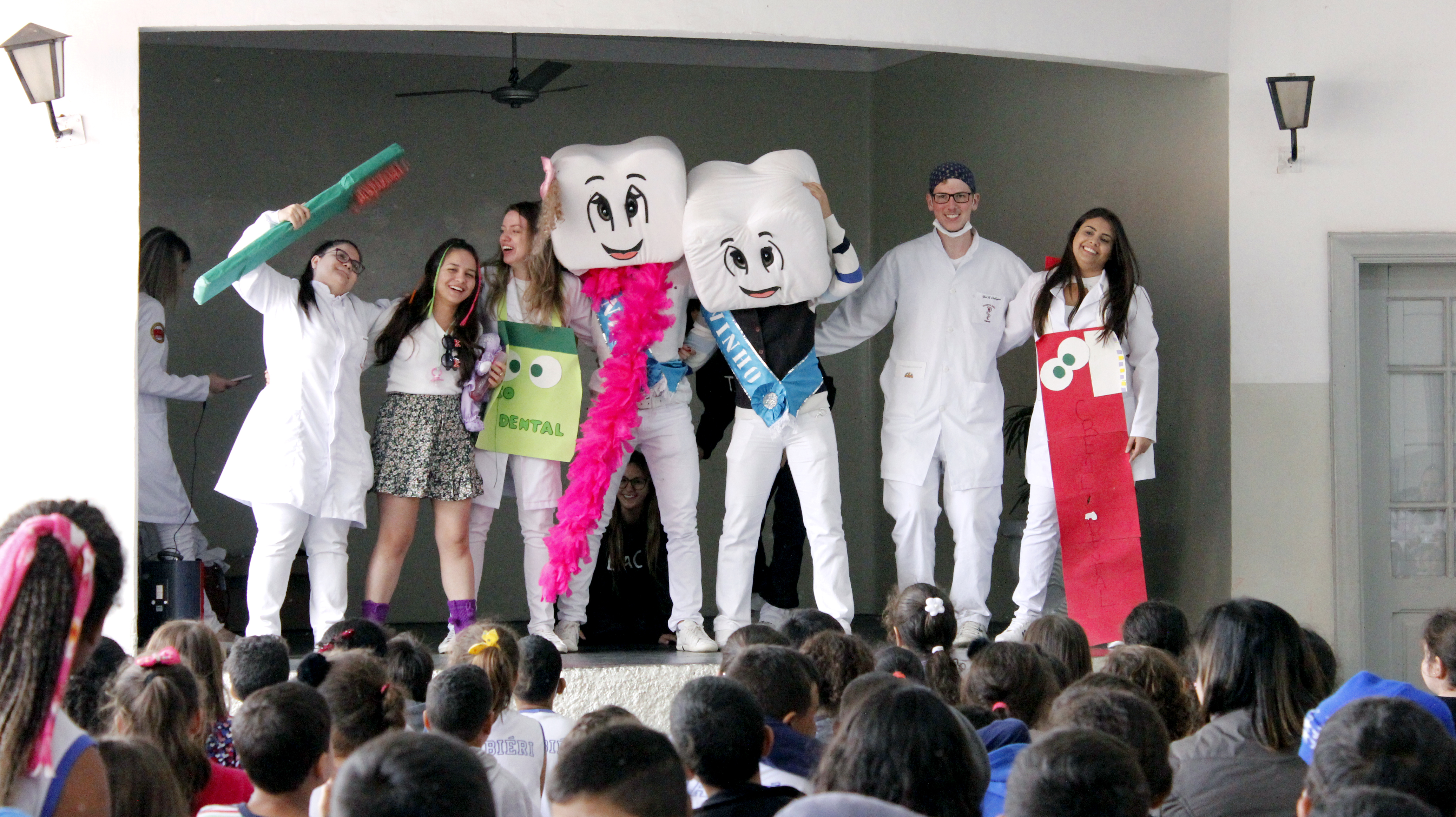 De acordo com a docente Ma. Bruna Trazzi Pagani, os acadêmicos apresentam um teatro utilizando fantasias de dentes, cáries, escova e pasta para explicar às crianças a importância da escovação. “Os alunos e docentes da Odontopediatria e Saúde Coletiva vieram até aqui explicar como funciona cada ‘dentinho’ nosso, o que temos que fazer para manter a higiene da boca e vivenciar na prática o atendimento a crianças”, explica.