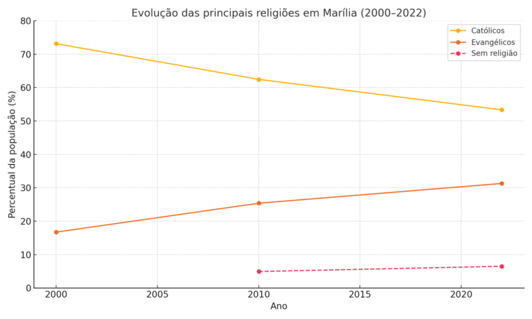 O levantamento do IBGE, divulgado na semana passada, revela que Marília segue as tendências nacionais: há uma diminuição significativa do número de católicos e um crescimento constante dos evangélicos — ainda que em ritmo mais brando nos últimos anos — além do aumento expressivo do grupo que se declara sem religião.