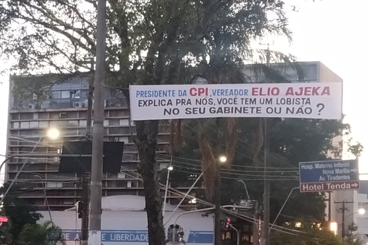 “Presidente da CPI, vereador Elio Ajeka explica para nós, você tem um lobista no seu gabinete ou não?”, questionam as faixas espalhadas principalmente na região central do município.