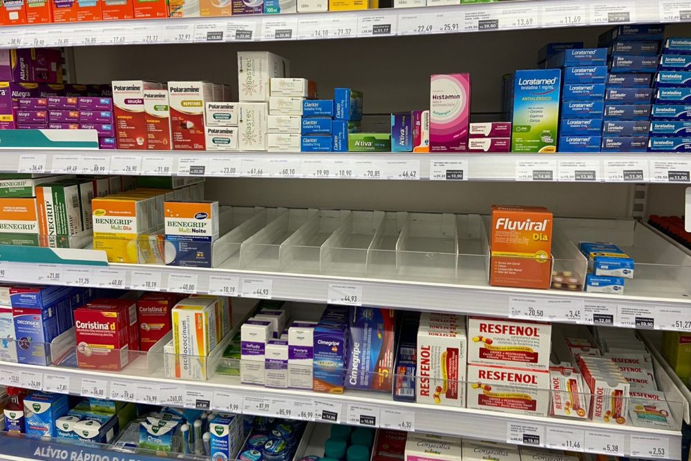 Parte da prateleira de medicamentos ficou vazia em uma das farmácias de Marília (Foto: Daniela Casale/Marília Notícia)