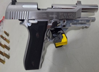 Na vistoria, os policiais encontraram duas pistolas calibre 9 mm da marca Taurus, ambas municiadas com 14 cartuchos cada, além de um carregador adicional com munições intactas e outros 42 cartuchos do mesmo calibre. As armas, de uso restrito, estavam prontas para uso.