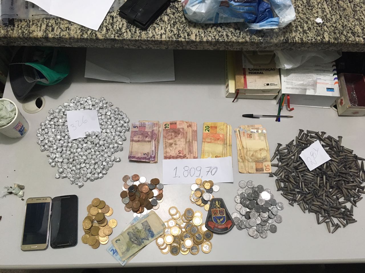 Ele foi abordado e detido. No local estavam sua mãe e duas irmãs e também foram localizados 282 pinos de cocaína, 326 porções de crack, 2 porções de maconha, além de mais de R$ 1,8 mil.