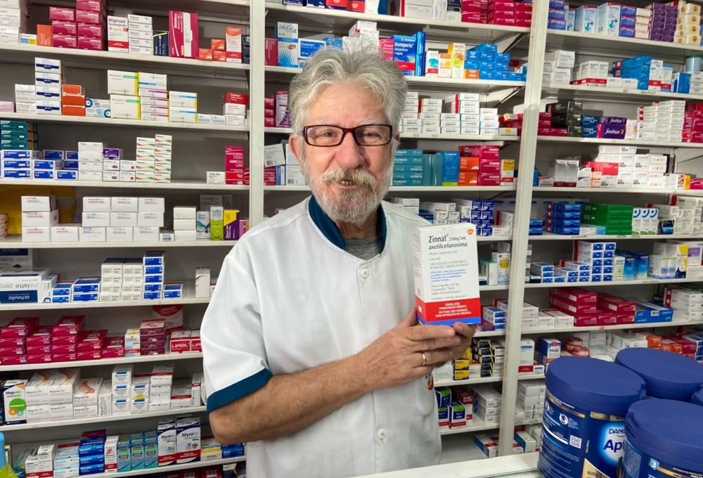 O atendente de farmácia Antônio Carlos Garcia, o Cebolinha, conta que antibióticos chegam aos poucos e insuficiente para atender toda a procura (Foto: Marcelo Moriyama)