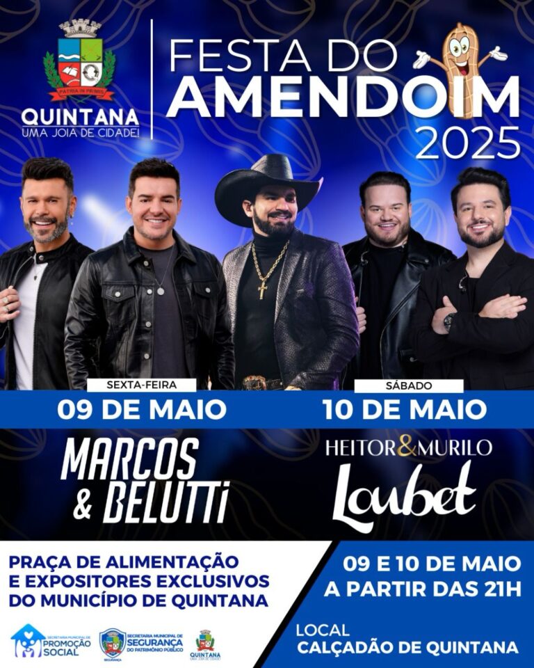 Na sexta-feira (9), a animação ficará por conta da dupla Marcos e Belutti, famosa por sucessos como ‘Aquele 1%’ e ‘Domingo de Manhã’, que prometem embalar os apaixonados pelo sertanejo. Já no sábado (10), a festa continua com as apresentações da dupla Heitor e Murilo, além do cantor Loubet, garantindo diversão para o público de Quintana e região.
