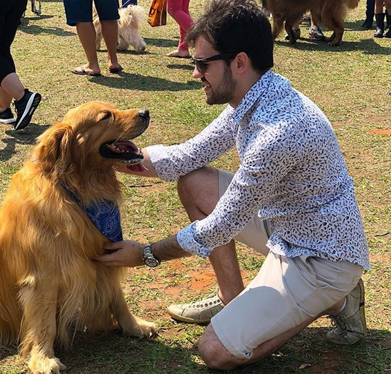 Lucas Colombera passeando com seu dog num domingo ensolarado.