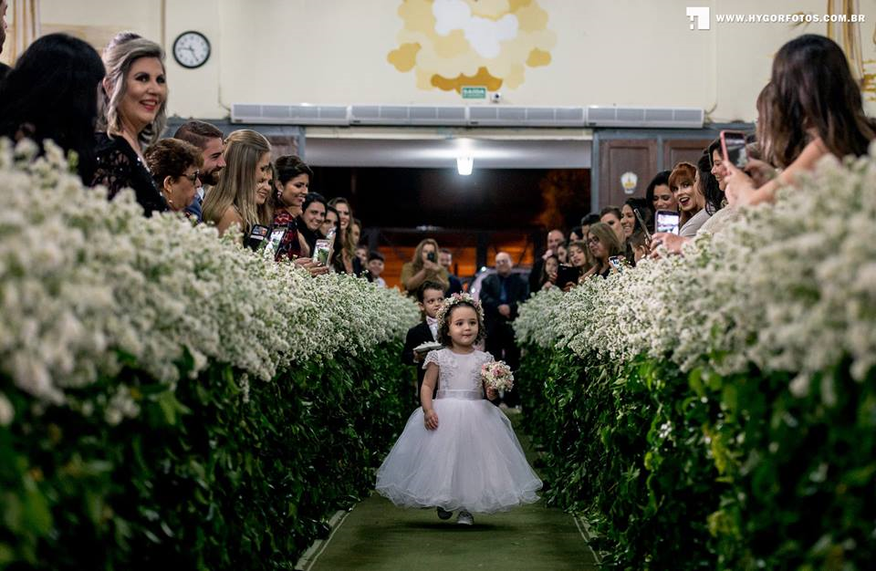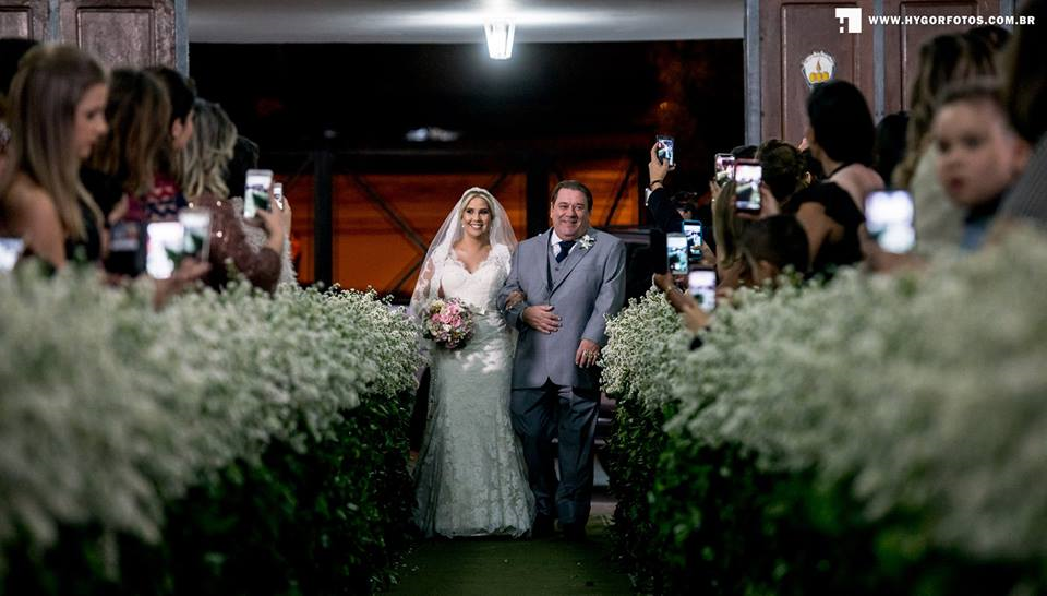 A noiva Tamyris Falcão sendo conduzida pelo seu pai.