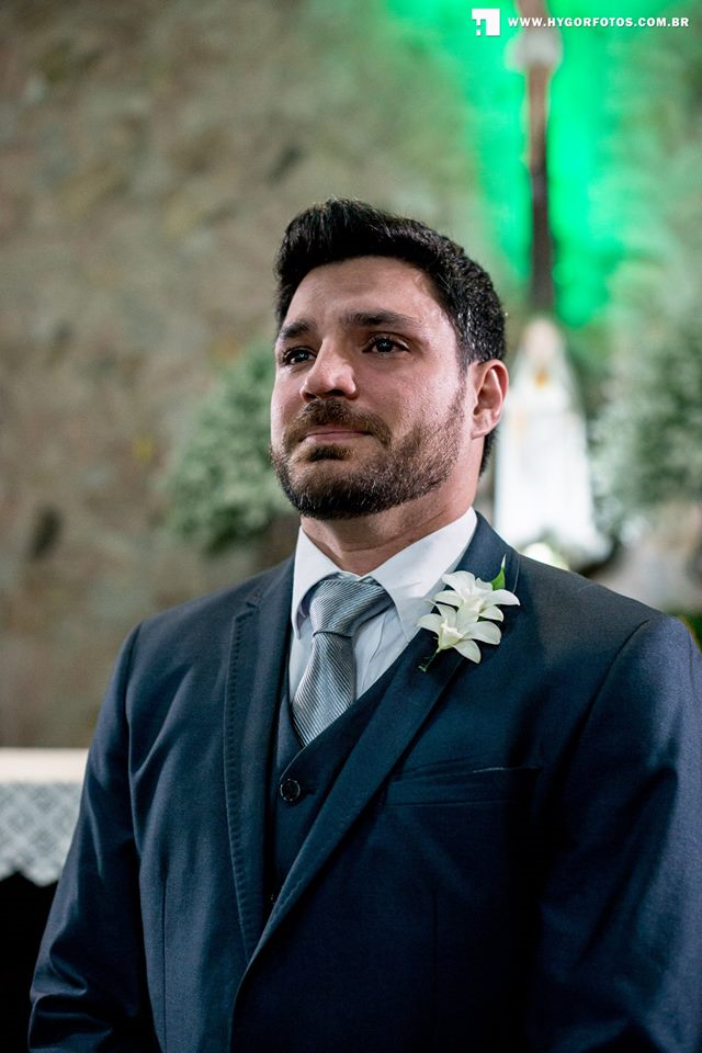 A emoção do noivo ao a ver noiva sendo conduzida pela nave da igreja.