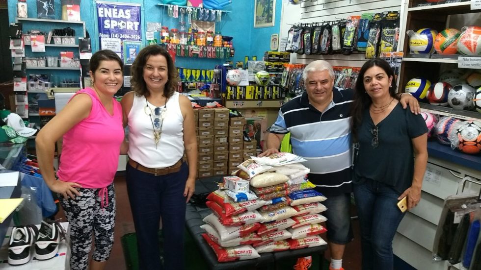 A primeira-dama e presidente do Fundo Social de Solidariedade, Cláudia Furlaneto dos Santos, esteve na manhã desta quinta-feira na loja Enéas Sport, recebendo 113 quilos de alimentos arrecadados com as inscrições no evento desta noite. Ela agradeceu a parceria e explicou que os alimentos serão destinados para famílias carentes do município.