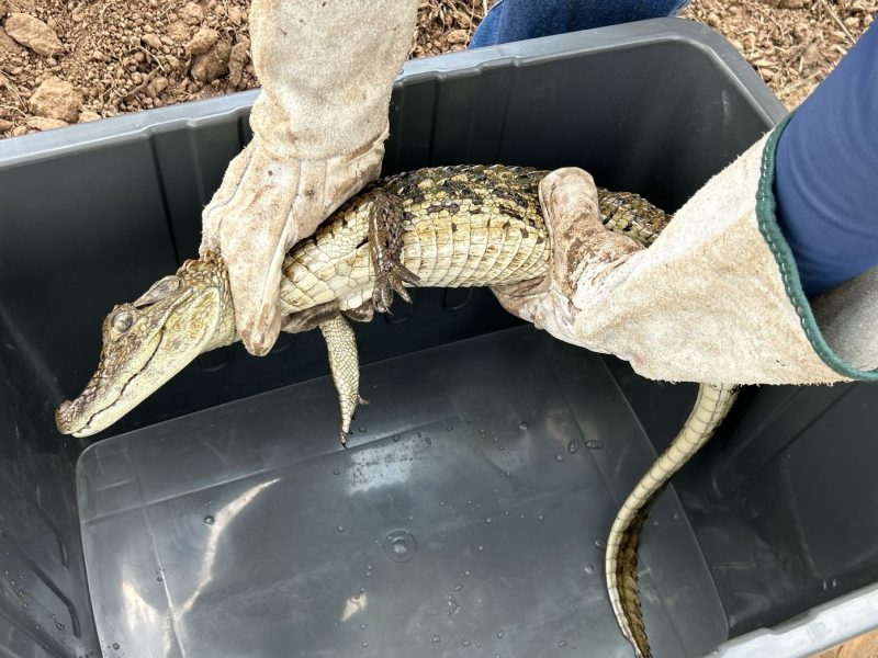 Um filhote de jacaré-do-papo-amarelo, da espécie Caiman latirostris, foi resgatado em um afluente na rodovia SP-333, próximo a Marília, nesta semana.