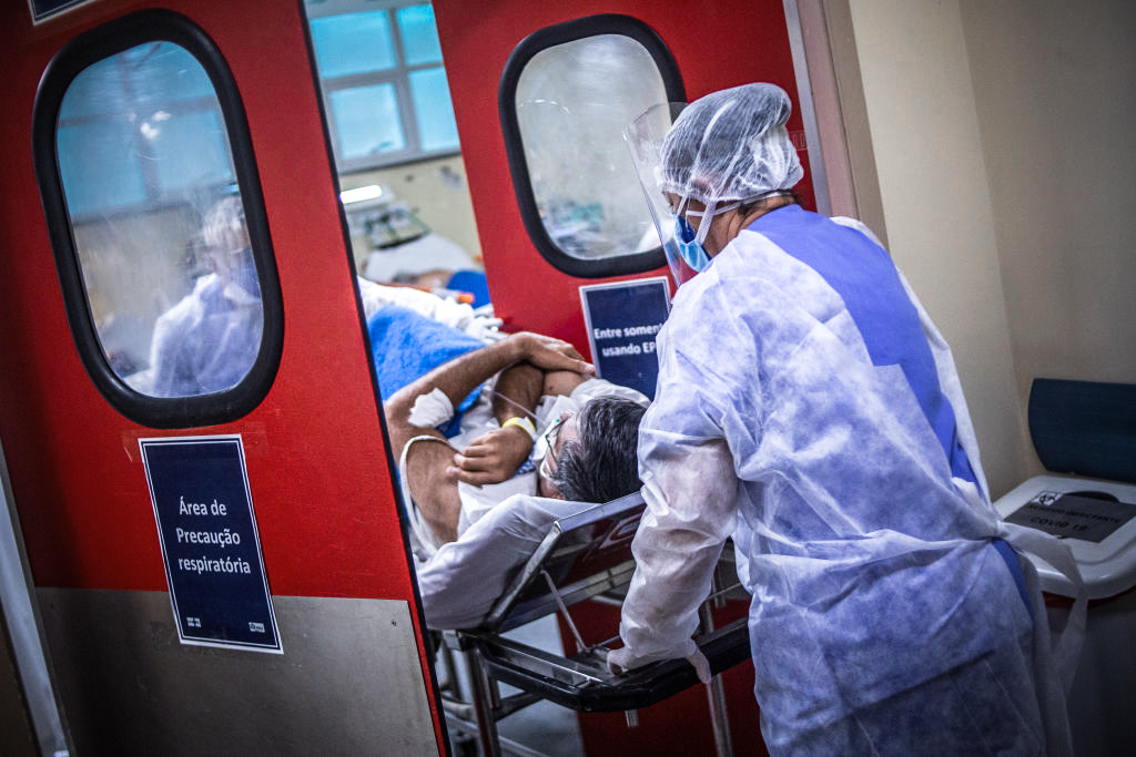 Healthcare workers move a Covid-19 patient to an isolation unit at Evandro Freire Municipal Hospital in Rio de Janeiro, Brazil, on Thursday, March 18, 2021. Brazil registered more than 90,000 Covid-19 cases for the first time on Wednesday, a second straight day of record numbers as the country fights against a health system collapse. Photographer: Andre Coelho/Bloomberg via Getty Images