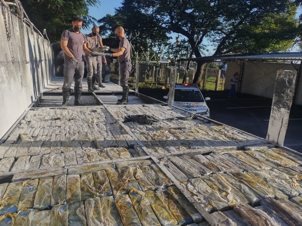 Policiais localizaram em junho de 2022 um carregamento com 2,6 toneladas de maconha em fundo falso de caminhão na SP-333 em Marília (Foto: Divulgação)