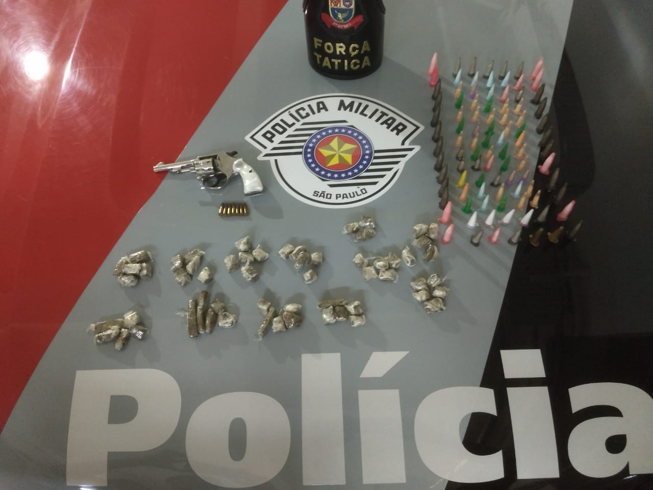 Um foragido da Justiça foi capturado nesta sexta-feira (18) com arma de fogo e 154 porções de maconha, cocaína e crack na zona Sul de Marília.
