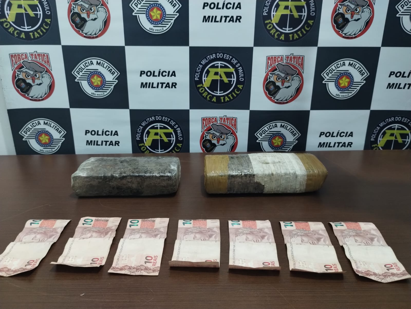 Na busca pessoal, os policiais encontraram R$ 70. Ao verificarem a sacola dispensada, se depararam com dois tijolos de maconha prensada.