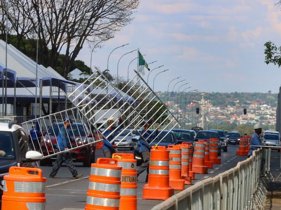 A Esplanada dos Ministérios já conta com estruturas montadas de palanques e arquibancadas, além de banneres decorativos nas fachadas dos prédios públicos.