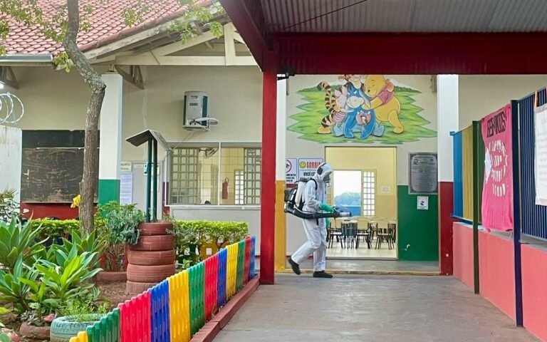 A nebulização aconteceu bem cedo para não atrapalhar o horário de aula dos alunos, a partir das 7h – a escola funcionou normalmente nessa quinta-feira.